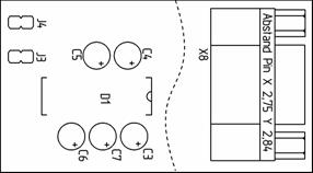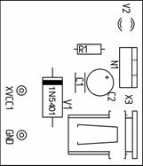 F !! Achten sie beim Bestücken auf die Polarität des C2 und auf die Richtung der Dioden und des Spannungsreglers. Die Metallseite des 7805 muss zum Leiterplattenrand zeigen. !!