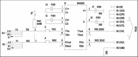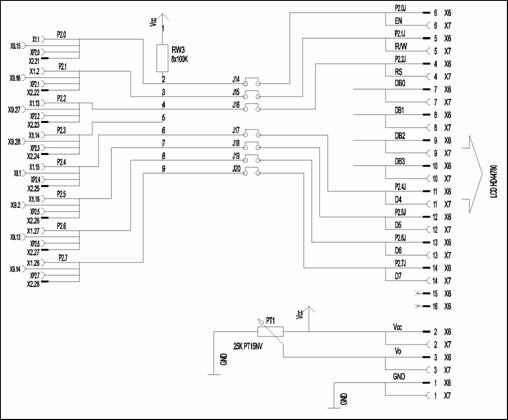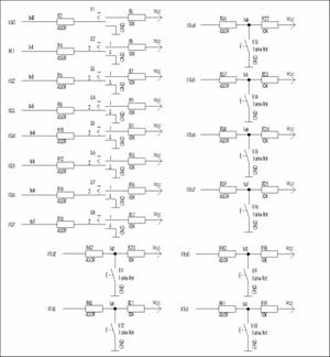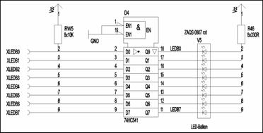 Um frei konfigurierbare LEDs auf dem LPC-Experimentierboard ansteuern zu können, ist eine Balken-LED mit aufgenommen worden. Als Treiber dient der 8-Bit Inverter 74HC540 (siehe Abbildung 8). Die Balken-LED wird über ein Widerstands-Netzwerk (8x330 Ohm) auf VCC gelegt. Damit der 74HC540 bei einem Defekt einfach ausgetauscht werden kann, wird dieser auf einen 20-poligen DIP-Sockel gesteckt.