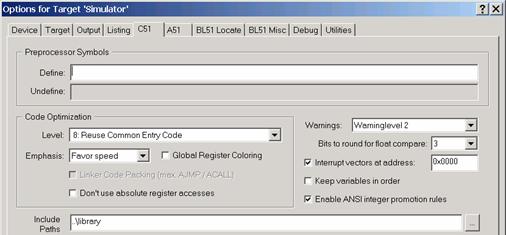 Soll die Libraryfunktion „v_PortConfig()“ in ein Projekt aufgenommen werden, muss das Sourcemodul „Portconfig.c“ ebenfalls in das Projekt aufgenommen werden. Damit der C51-Compiler das H-File „PortConfig.h“ findet, muss das Verzeichnis, in dem das H-File abgespeichert ist, im Window „Options for Target“, Reiter „C51“ im Eingabefeld „Include Paths“ angegeben werden (siehe Abbildung 43). Erstellen sie das Projekt aus Tabelle 57. Der C51-Compiler sowie der BL51-Linker müssen ohne Fehler durchlaufen. Wenn sie das Projekt anschließend durchsteppen, müssen die LEDs an Port 2 den Zustand wechseln.