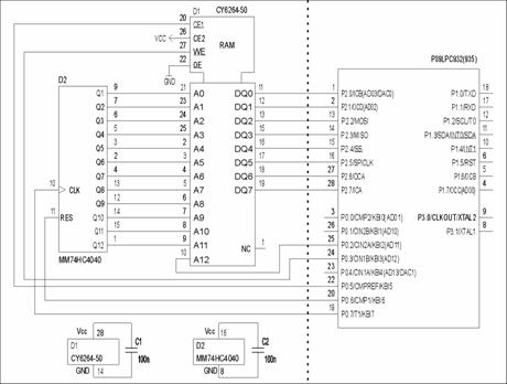 Da der P89LPC932/935 nur über einen 512-Byte großen XRAM-Bereich verfügt, können größere Datenmengen, die z. B. bei einer kontinuierlichen A/D-Wandlung über einen gewissen Zeitraum entstehen, nicht zwischengespeichert werden. Um den RAM-Speicher zu vergrößern, sind folgende Möglichkeiten denkbar: